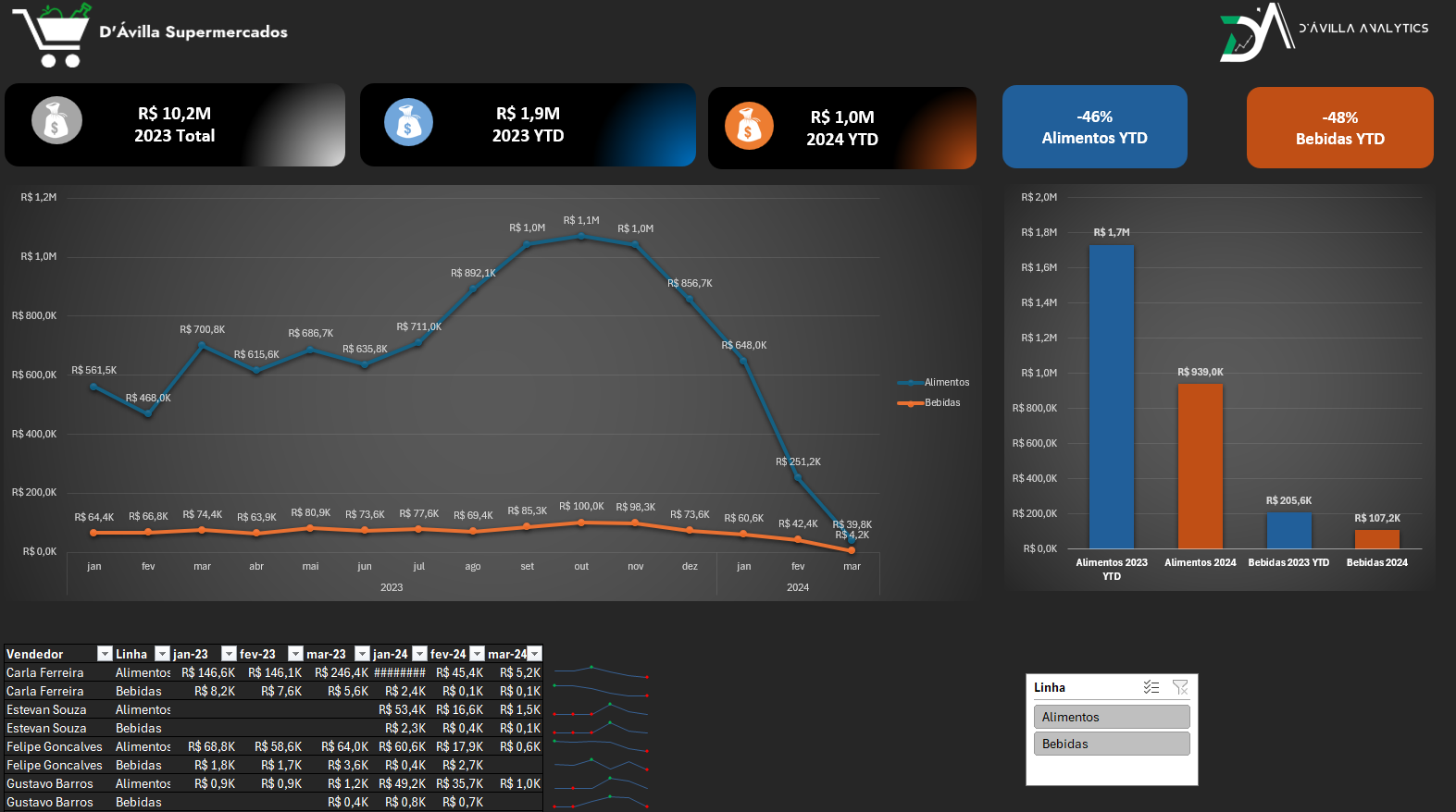 Painel de vendas para acompanhamento mês a mês por tipo, produto e vendedor, para decisões mais rápidas e estratégicas.